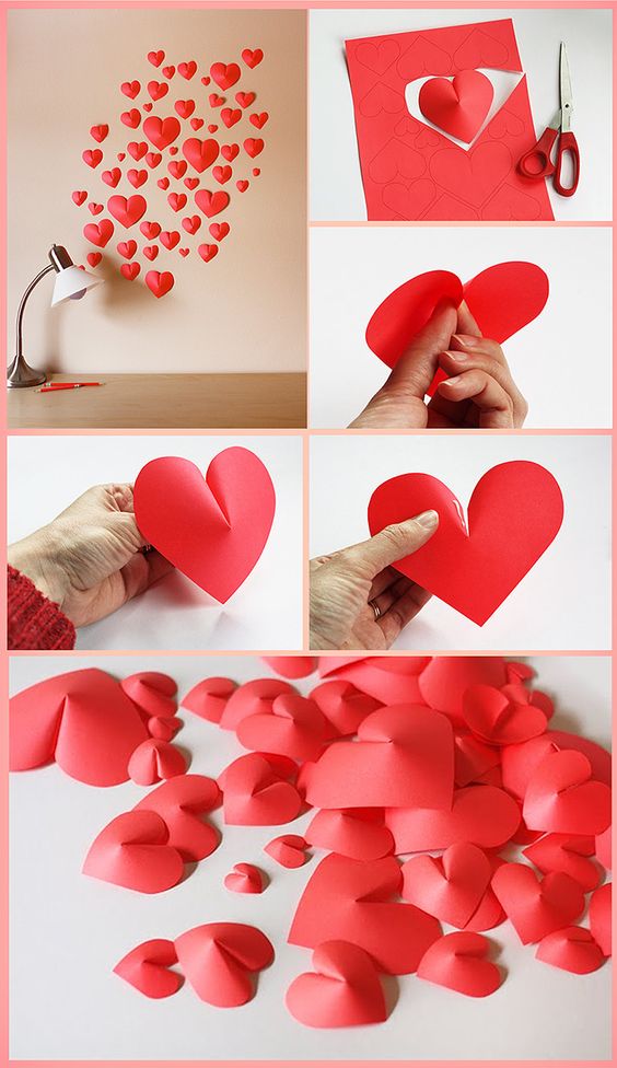 A parede do quarto de vocês vai ficar linda com corações 3D, que são feitos com papel estruturado e colados na parede com fita adesiva dupla face.