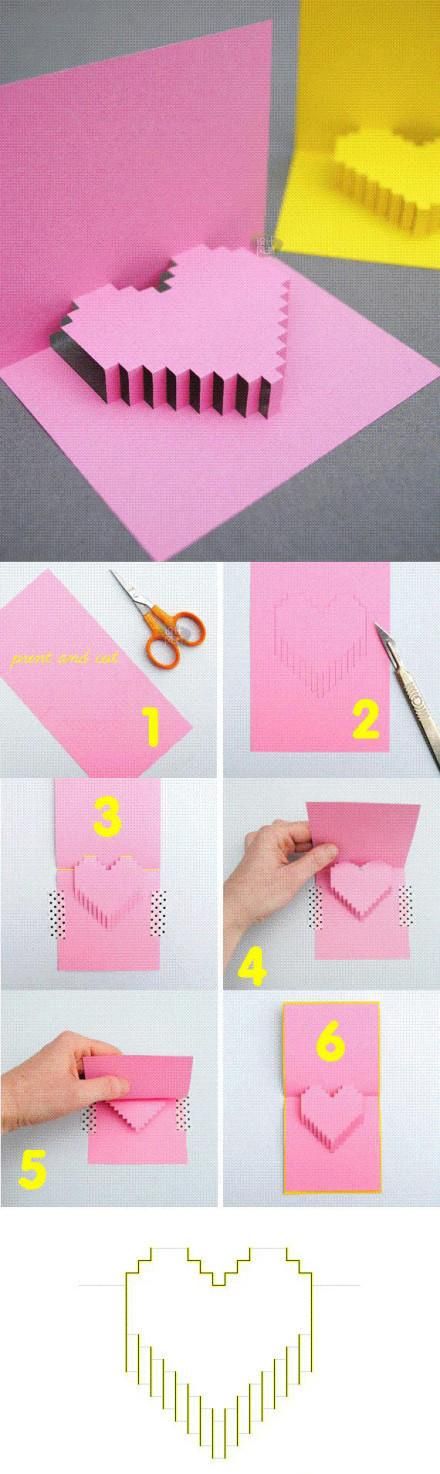 Faça um cartão 3D para o dia dos namorados imprimindo o molde, transferindo-os e cortando nas partes indicadas. Depois dobre nas marcações e cole esta parte em um cartão pronto ou em um feito por você.