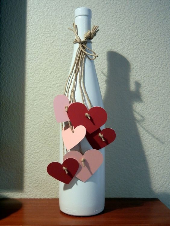 Quem não tem nenhuma experiência em fazer artesanatos, mas quer decorar a casa para o dia dos namorados, pode cortar corações em um papel estruturado, furá-lo no meio e passar pedaços de fio rústico ou cordão de sua preferência e amarrar em uma garrafa.
