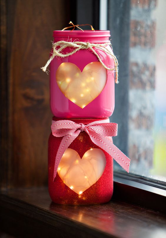 Entre as muitas ideias de artesanatos para dia dos namorados destaca-se também a lanterna feita com pote de vidro e papel enrolado ao redor, mas com um coração vazado. Decore o pote como você quiser e coloque dentro um pisca-pisca, para conseguir um efeito luminoso muito interessante no quarto de vocês.