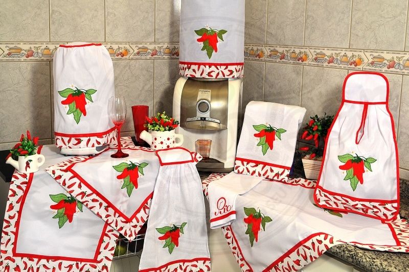Além da pintura em tecido você também pode fazer o seu jogo de cozinha com detalhes bordados à mão. E este bordado pode tanto ser bordado em ponto cruz quanto qualquer outro tipo de bordado, como até mesmo aquele bordado simples, do tempo da vovó.