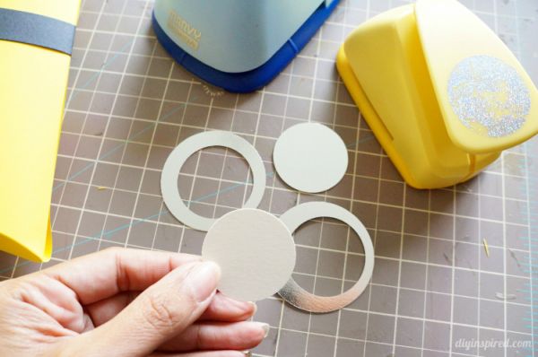 Agora, corte um círculo vazado de papel cinza e um círculo de papel branco, para fazer um olho.