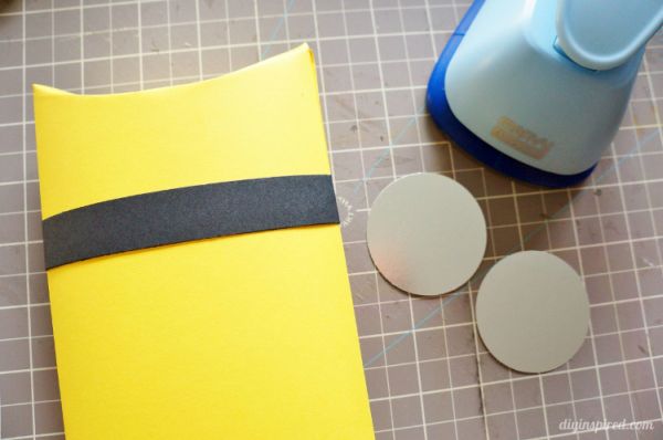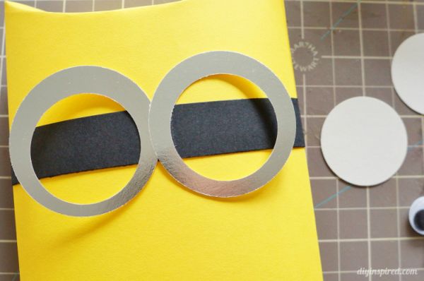 E para fazer os olhos de seus Minions você pode cortar dois círculos de papel cinza de sua preferência, colar sobre uma tira de papel preta e dentro do círculo cinza colar olhos de plástico que se movem.