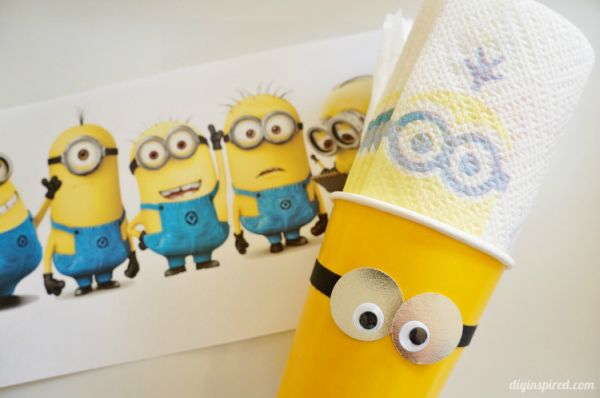 Aposte em copos amarelos decorados com os olhos dos Minions para acomodar os guardanapos da sua festa.