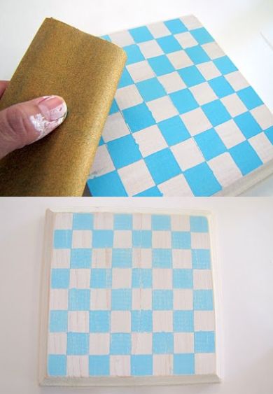 Em seguida, aplique fita adesiva também de forma quadriculada, para que fiquem expostos os quadrinhos que precisam receber a outra cor de tinta.