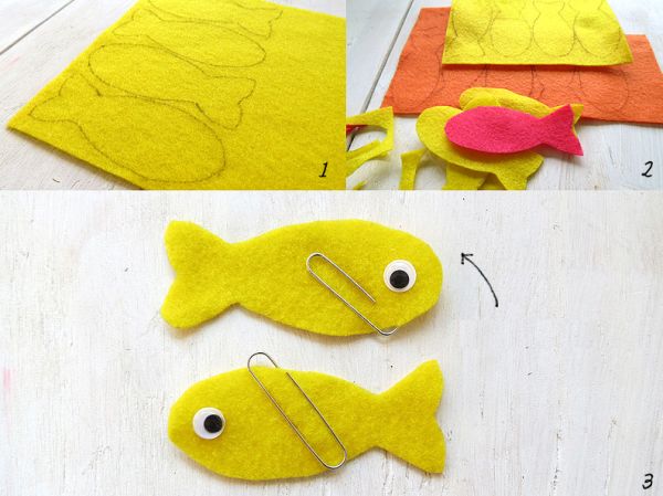 Comece transferindo o molde do peixinho para os retalhos de feltro. Recorte. Cole os olhos de plástico, com o auxílio da pistola de cola quente, em seu peixinho. E posicione um clipe de papel em cada peixinho, em posição diagonal.