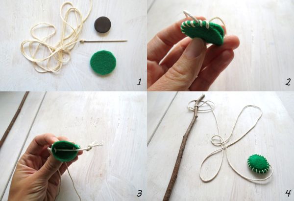 Em seguida, corte alguns círculos de feltro com tamanho um pouco maior que o tamanho do imã. E com a agulha para bordado e com a linha, dê pontos ao redor de dois círculos, fechando-os juntos, porém perto de chegar ao final, coloque dentro um pedaço comprido de barbante e o imã, e termine de fechar. Depois amarre a outra ponta do barbante na vara.
