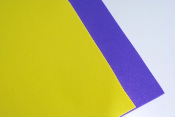 Comece cortando dois retângulos nos EVAs escolhidos, cortando um retângulo em cada cor de EVA, com o retângulo com a cor que vai ficar por fora sendo um pouco maior que o retângulo que vai ficar por dentro.