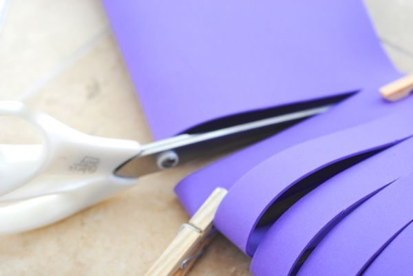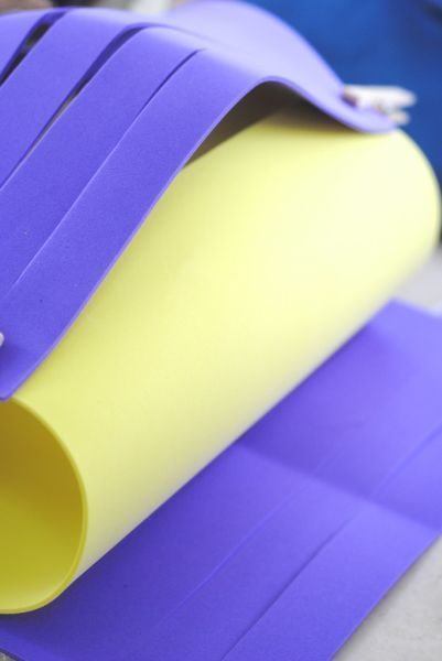Logo após, dobre o retângulo maior ao meio, prenda, com o auxílio dos prendedores para roupas, e comece a cortar tirinhas na dobra do EVA, com o auxílio da tesoura comum, mas sem chegar ao final da peça.