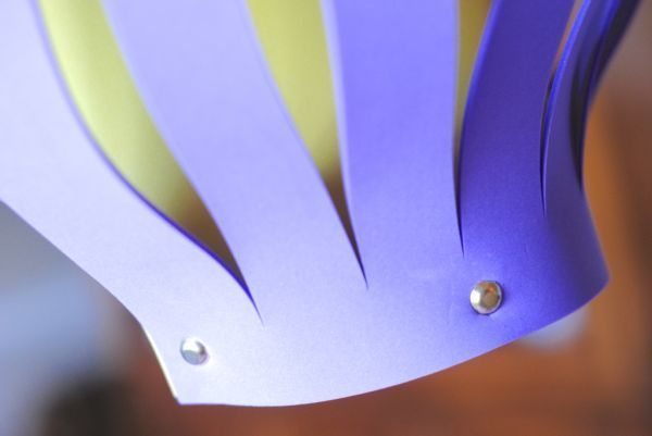 Agora, para finalizar a sua peça, assim que você tiver fixado todas as tachinhas necessárias para prender as duas partes de sua lanterna, pregue uma alça feita de EVA (com a alça sendo da cor de dentro da sua peça) na parte de cima de sua lanterna. E está pronto!