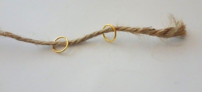 Comece separando todos os materiais que você vai utilizar em seu artesanato. Depois passe duas argolinhas de metal pelo fio rústico escolhido.