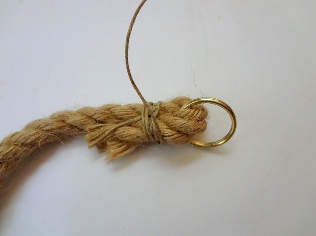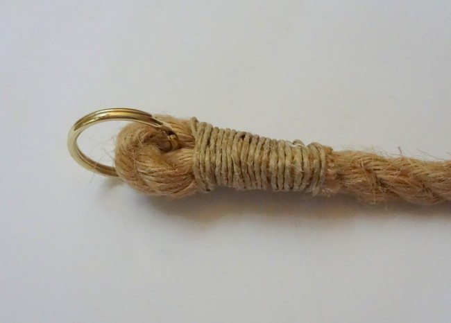 Faça o mesmo processo na outra ponta do pedaço de corda, com o tamanho do detalhe feito com o fio rústico ficando de acordo com a sua preferência.