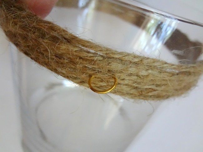 Continuando com a confecção da lanterna de potes de vidro passo a passo, pegue a corda escolhida, passe a argolinha que vai ficar na ponta da alça, e amarre as partes da corda com o auxílio do fio rústico ou de outra linha de sua preferência. Amarre muito bem, para que não se solte com o passar do tempo.