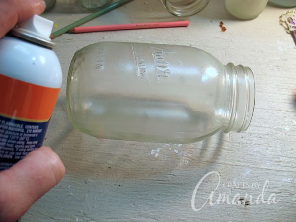 Comece separando todos os materiais que você vai utilizar em seu artesanato. Depois forre o local onde você vai trabalhar com a sua peça, com jornal velho, papel velho, papelão ou plástico. Então, aplique a cola em spray por toda a parte do pote de vidro que irá receber a renda.