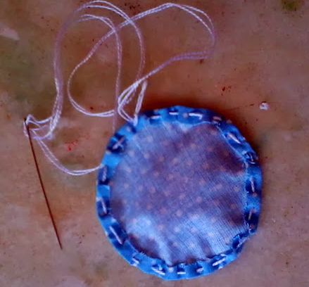 Em seguida, faça o fuxico alinhavando as bordas dos círculos, puxando a linha e franzindo o tecido. E para finalizar costure uma pérola no centro do fuxico para garantir um bom acabamento.