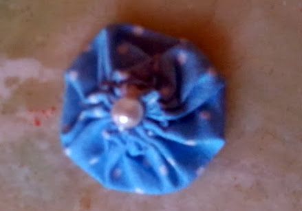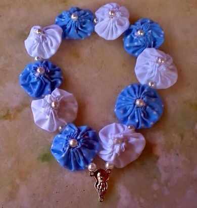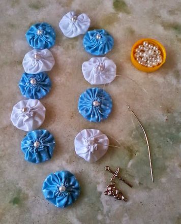 Logo após, com o auxílio da agulha, passe na linha de nylon, uma pérola e um fuxico, uma pérola e um fuxico, até fechar os 10 fuxicos.