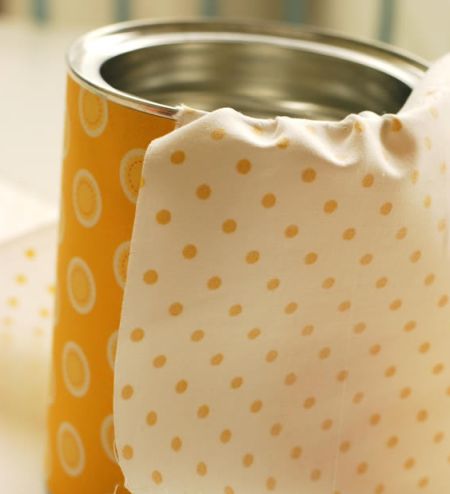 Logo após, corte também o tecido com a mesma altura e diâmetro da lata e cole com a cola quente ao redor de toda a borda da alta, mas cole muito bem para não se soltar com facilidade.