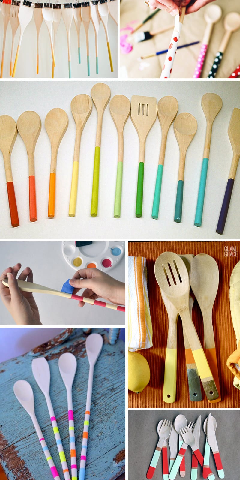 Outra fácil lembrancinha para chá de panela é a colher de pau personalizada. Pinte os cabos com as cores que quiser e da maneira que quiser. Fixe antes de pintar alguns pedaços de fita adesiva, para delimitar os espaços e utilize um pincel para aplicar a tinta.