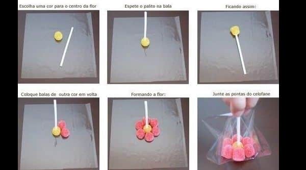 Fazer uma florzinha de goma é ainda mais fácil, com um quadrado de plástico sobre a mesa basta você fixar um palito em uma goma amarela, para ser o miolo, colocar 6 gomas ao redor e amarrar as pontas do plástico para cima, de forma bem justa, para manter o formato de flor.