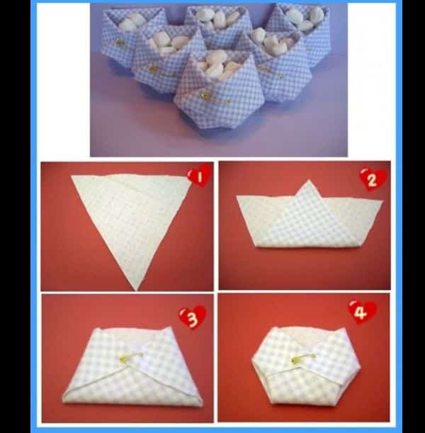 Comece separando todos os materiais que você vai utilizar em seu artesanato. Corte um triangulo no tecido. Com o avesso do tecido para cima, dobre a ponta do triângulo até ficar um pouco além da linha da base. Dobre as laterais até o meio e prenda todas as partes com o alfinete de segurança. Coloque os cantos inferiores para dentro, até formar uma fraldinha, e dobre a borda superior para dentro. Para finalizar a sua peça, encha a fralda com guloseimas. E está pronto!