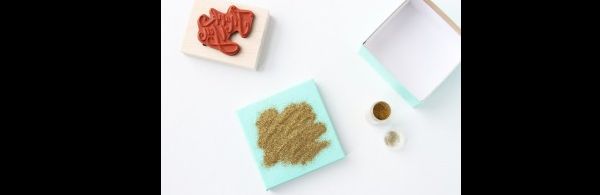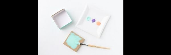 Quando a tinta secar, carimbe a tampa da caixa com outra cor de tinta acrílica. Se você não tiver carimbo, escreva à mão com a tinta acrílica.
