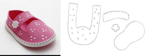 Transfira as partes do molde para o EVA, recorte e cole o corpo do sapatinho no solado. Agora, basta colar as partes que são os detalhes e enfeitar o sapatinho como quiser.