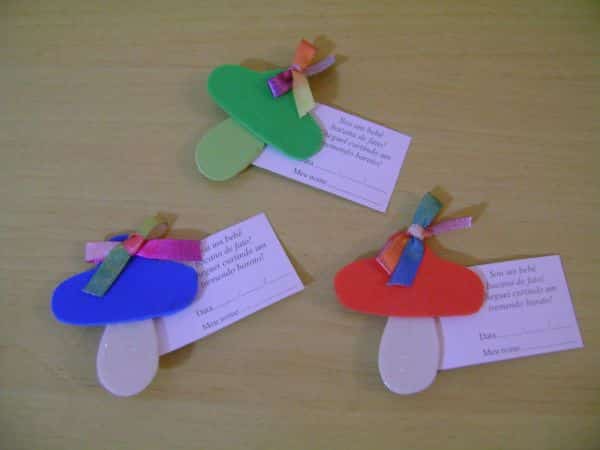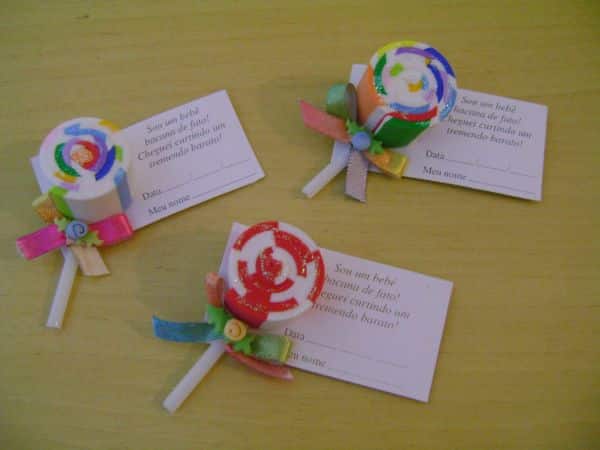 Mesmo com o orçamento apertado e sem muita experiência em fazer artesanatos você consegue improvisar uma bela lembrança para o seu pequeno ou para a sua pequena. Até com pedacinhos de EVA você consegue confeccionar uma linda lembrancinha, que pode ser decorada com outros materiais também bem baratos, como canetas coloridas, lacinhos prontos baratinhos ou com florzinhas recortadas de outra cor de EVA, por exemplo.