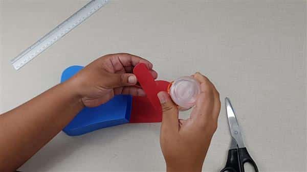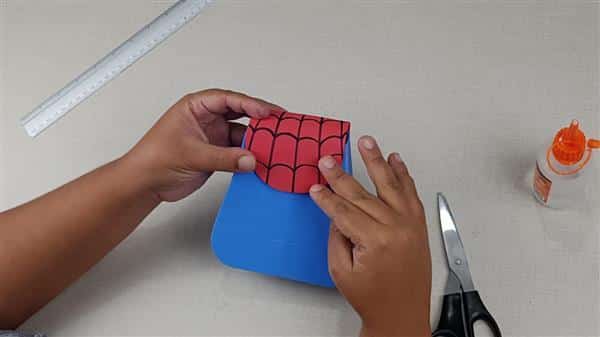 Depois de cortado faça a junção das partes frontal com a lateral, vá colando aos poucos conforme imagens demonstrativas; Depois de colar toda a lateral da sua mochilinha ela ficará como na imagem abaixo, caso sobre as laterais você deverá cortar os excessos de EVA e deixar certinha sua lateral; Feito isso passe cola na outra parte da base e cole com bastante cuidado, novamente fique atento para caso haja sobras do EVA você acerte para que o acabamento fique bonito. Separe.Na parte da aba da mochila (parte vermelha), com a ajuda de uma caneta permanente desenhe sua teia de aranha, você poderá utilizar a régua para te auxiliar na hora de fazer as linhas, e caso ache mais fácil marque estas linhas com lápis ou a ponta do palito de churrasco para que fique certinho;
