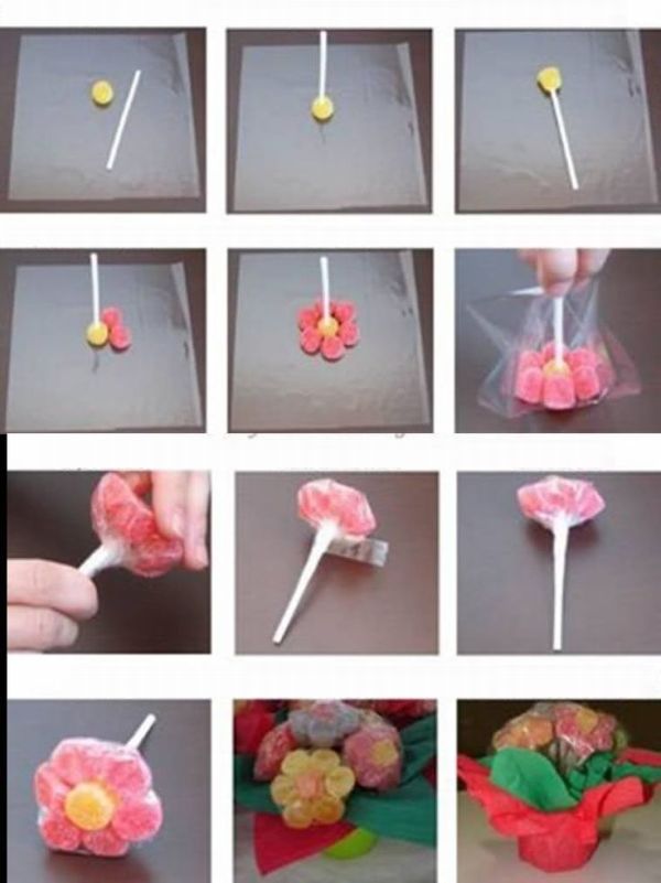 Corte o papel celofane em quadrado e coloque as gomas no meio, com uma goma para ser o miolo da flor e seis gomas ao redor, com outra cor. Fixe o palito na goma do meio, na goma que é o miolo da flor. Junte o papel celofane, prendendo muito bem todas as gomas juntas, mas mantendo-as na posição de flor. Para finalizar a sua peça, prenda a base da flor com um pedaço de fita adesiva. E está pronto! Você pode oferecer somente a flor como lembrancinha ou formar um arranjo em um vasinho.