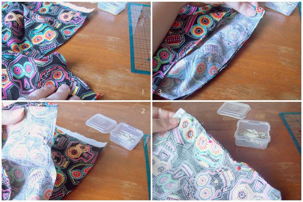 Agora, comece a prender cada canto, juntando as partes do quadrado que foram cortadas, mas deixando a parte do avesso do tecido para fora.