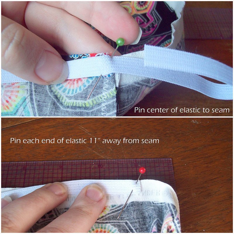 Em seguida, prenda a metade do pedaço de elástico na costura do canto. Logo após, estique um pouco o elástico e prenda a ponta. E faça isso do outro lado. Lembrando que a medida utilizada para puxar o elástico deverá ser a mesma em todos os pedaços. E você pode utilizar a medida que achar melhor para encaixar em seu colchão, com um elástico mais esticado sendo mais indicado para um colchão mais fino, para não se soltar.