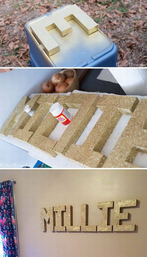 Comece separando todos os materiais que você vai utilizar em suas letras decoradas. Forre o local onde você vai trabalhar com a sua peça, com jornal velho, papel velho, papelão, tecido velho ou plástico. Pinte a letra com a cor escolhida. Se você quiser uma cor mais forte e intensa, aplique duas ou até mesmo três camadas de tinta, porém sempre deixando a tinta secar muito bem entre uma camada e outra. E deixe a tinta secar muito bem antes de manusear novamente a sua peça e continuar com a confecção de seu trabalho. Aplique cola para decoupage e jogue o glitter sobre a letra. Se quiser, você pode criar um efeito degradê com o glitter, aplicando vários tons sobre uma letra. Para finalizar a sua peça, faça o mesmo processo com as outras letras que for usar. E está pronto!