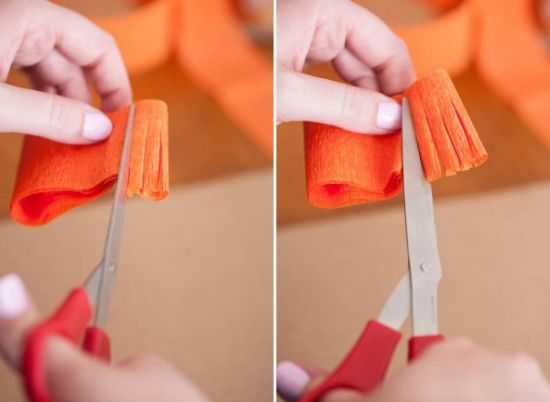 Em seguida, corte tiras no papel crepom e enrole esta tira em sua mão.