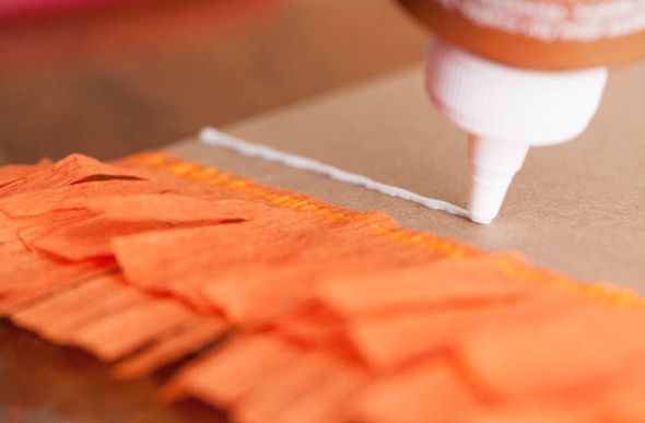 Em seguida, continue colando as tiras de papel crepom com franja, e da mesma maneira. Aplicando um fio de cola um pouco acima da última tira de papel crepom e posicionando outra tira de papel crepom, colando-a.