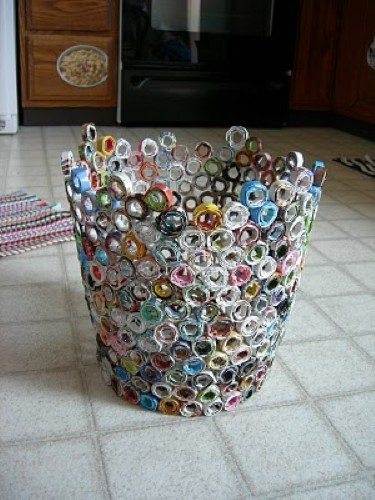 Essa lixeira os canudos foram transformados em argolas e unidas uma a outra, uma ideia bem legal para criar um objeto para ter em casa!