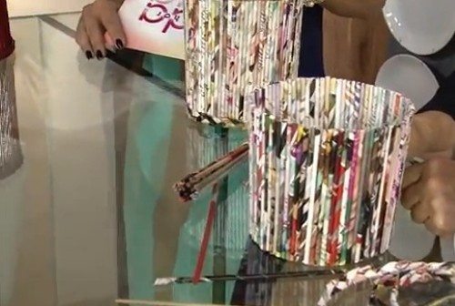 - Faça uma trança com as tiras de revista e cole na parte de baixo da lata de lixo.