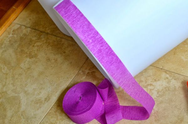 Comece cortando a folha de papel crepom em tiras, com a espessura de sua preferência. Depois esfregue e espalhe a cola do bastão na base da lixeira, e posicione a ponta da tira de papel crepom sobre esta cola aplicada.