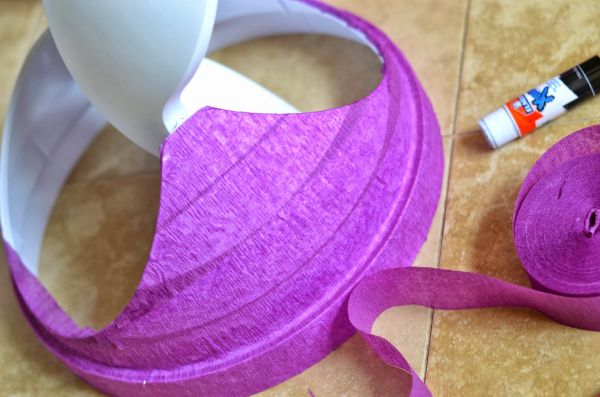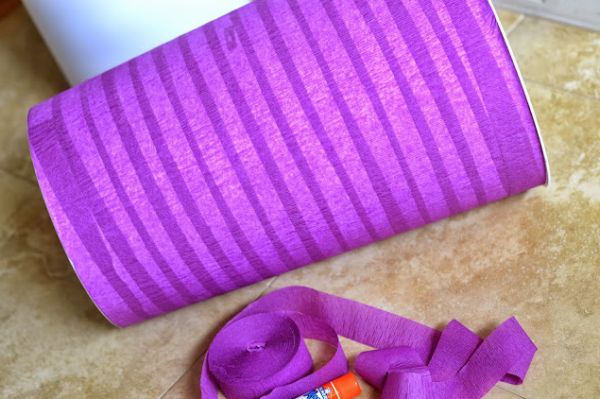 Em seguida, vá aplicando a cola em bastão e enrolando as tiras de papel crepom ao redor da lixeira até chegar à borda da peça.