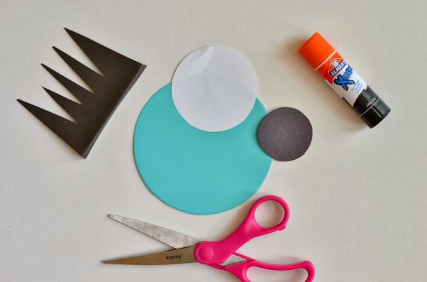 Agora, para finalizar a sua peça, basta você cortar círculos com tamanhos decrescentes nos papéis azul, branco e preto, sendo que o círculo azul deverá ser o maior, o círculo branco com tamanho intermediário e o círculo preto com tamanho menor. E corte também o cabelo do monstro, cortando um pedaço de papel preto com pontas. E cole todas estas partes na tampa da lixeira, com o auxílio da pistola de cola quente, com o círculo preto sendo colado dentro do círculo branco e este dentro do círculo azul e cole o cabelo bem no topo da tampa da sua lixeira. E está pronto!