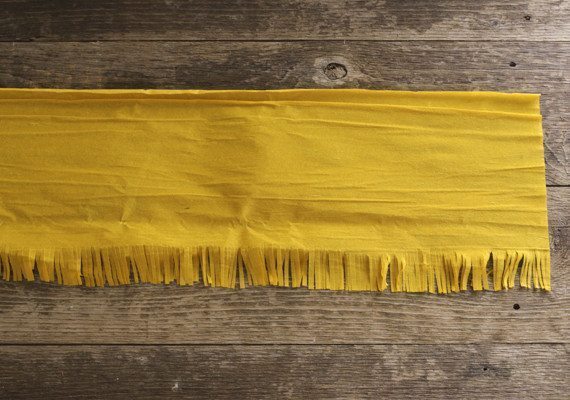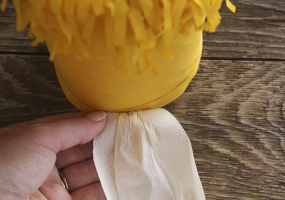 Logo após, faça uma franja em uma das extremidades da tira de papel crepom conseguida, cortado tirinhas com tamanhos iguais.