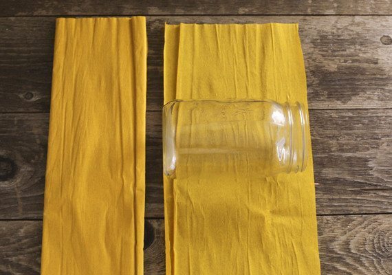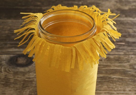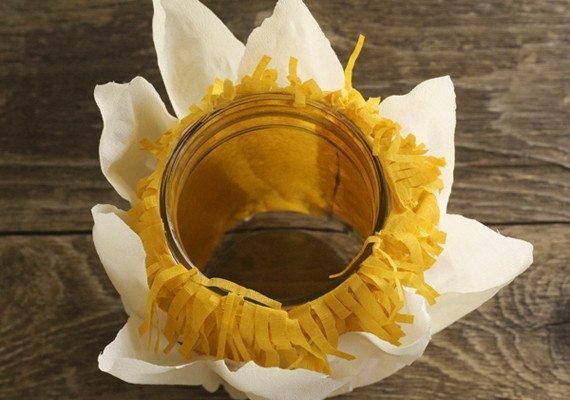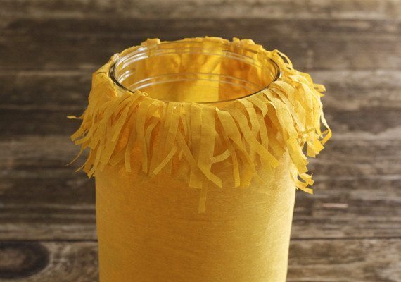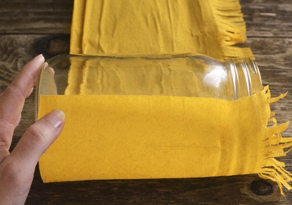 Agora, enrole a tira de papel ao redor do pote ou do vidro escolhido, com as franjas para cima.