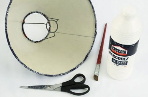 Para fazer esta linda e sofisticada peça você irá precisar de: 1 garrafa de licor reciclada (ou outra garrafa com modelo de sua preferência);  1 cúpula de abajur antiga; cola branca Cascorez; pincel chato n° 20; tesoura; pregadores de roupas; e 50 cm de tecido azul-escuro estampado com arabescos brancos (ou com a cor ou estampa de sua preferência).