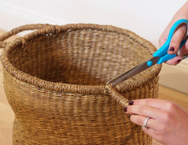 Em seguida, corte as alças de seu cesto, caso o seu modelo possua alças. E nesta etapa você pode cortar as alças com uma tesoura comum ou com uma faca bem afiada, de acordo com a sua preferência.