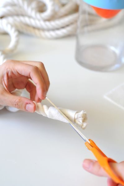 Logo após, cole a ponta da corda na base do suporte escolhido. E vá enrolando a corda ao redor do suporte e também do balão, e sempre colando entre uma volta e outra da corda, para que fique bem firme.