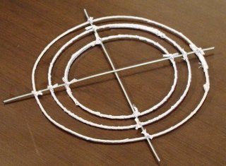 Logo após, cruze as duas varetas de metal sobre os três círculos de arame já encapados e fixe as varetas. Esta será a estrutura da sua luminária.