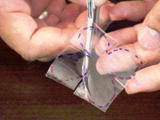 Em seguida, transfira o molde escolhido para o quadrado de plástico, com o auxílio da caneta marcadora para plástico, e com as pétalas posicionadas nas partes formadas após os cortes.