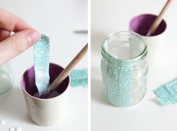 Comece medindo a altura do seu pote de vidro no tecido escolhido, deitando o pote sobre o tecido e medindo assim o pote, com o auxílio do lápis ou da caneta. Depois, assim que você conseguir a medida necessária corte tirinhas com a espessura que você quiser, e com o comprimento ficando com o mesmo tamanho da altura do pote de vidro escolhido. E coloque a cola dentro do recipiente.