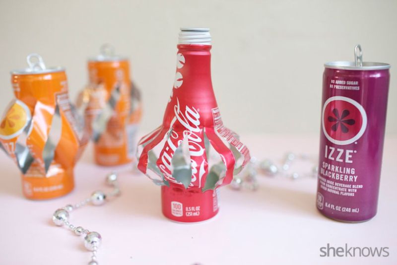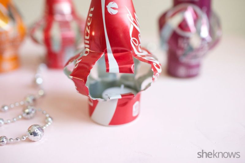 Continuando com a confecção das luminárias com latas de alumínio, amasse um pouco a lata, para que os cortes feitos na lata façam as tiras de alumínio “saltarem” para fora, para criar a sua peça.