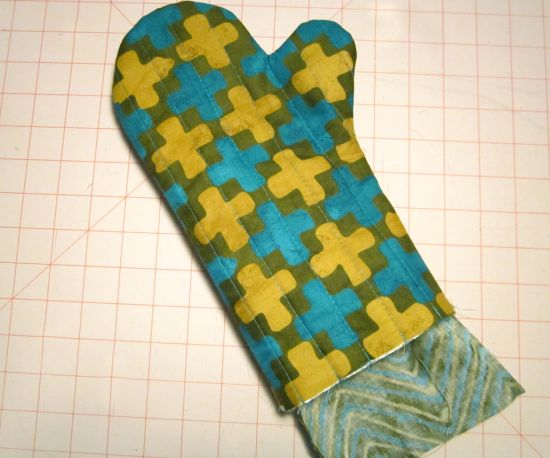 Em seguida, posicione uma luva térmica lado direito para cima (lado brilhante para cima) na superfície de trabalho. Posicione uma luva exterior do lado direito em cima da luva térmica. Alinhe as peças para igualar as duas luvas perfeitamente. Alfinete por toda a borda e também no meio. Repita com os outros pares. Com a camada exterior lado direito para cima, faça o quilt, uma parte de cada vez em toda a largura de cada luva.