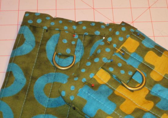 Agora, para finalizar, corte dois retângulos de 10 cm x 4 cm para fazer a tirinha para colocar a argola. Dobre cada retângulo ao meio, com os lados direitos juntos e costure ao longo de cada tira dobrada. Desvire a tira. Dobre as tiras e coloque a argola. Posicione essa tirinha com a argola e costure no punho embutida em um viés de tecido feito por você e com a estampa de sua preferência. E está pronto!